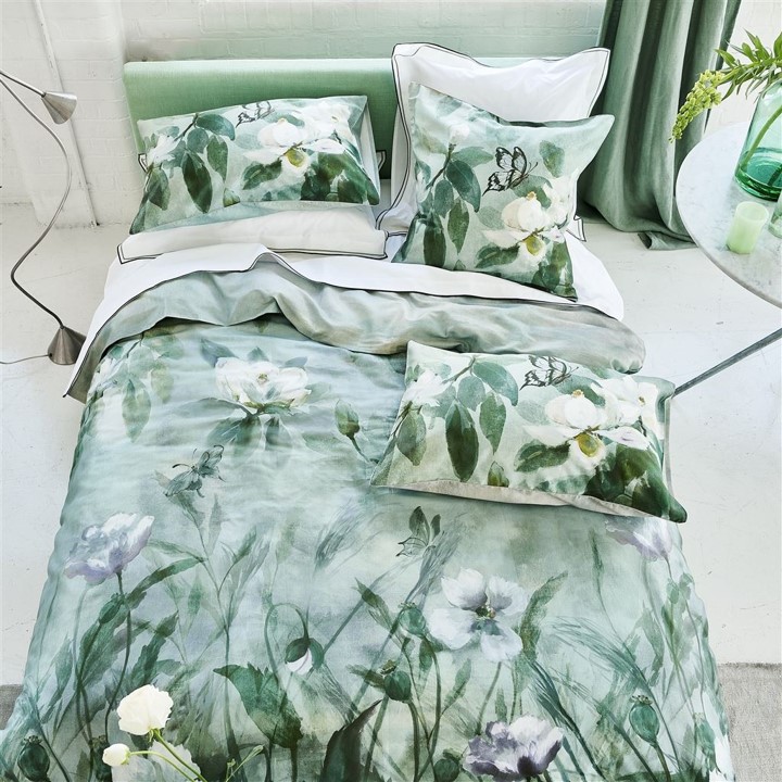 In blissful tones of celadon and jade, this serene bedding design creates a romantic mood with watercolour leaves, layered amidst magnolia flower blossoms. Digitally printed onto 200 thread count cotton sateen for a touch of pure luxury. Pillowcases are beautifully detailed with a pale grey trim. This stunning floral bed linen reverses to a watercolour textured print.